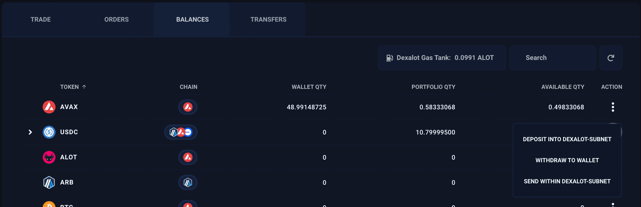 On the Balances tab, select to deposit into the Dexalot L1.