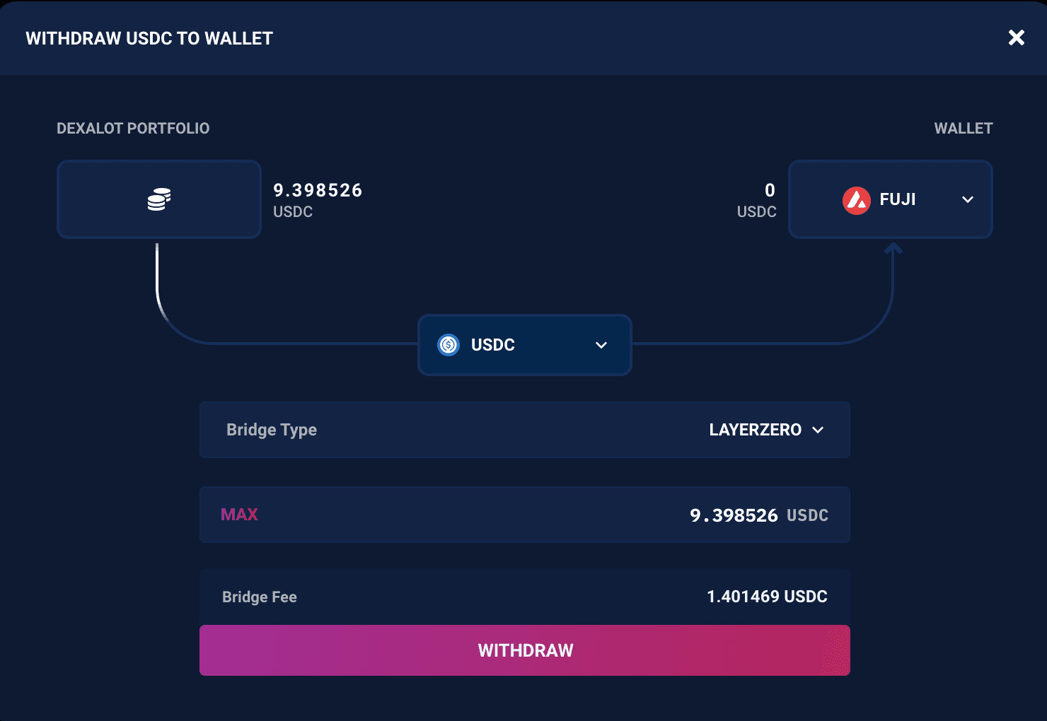 Make sure the network is set to Fuji C-Chain and enter the amount you want to withdraw. Click on the Withdraw button and confirm the transaction in your wallet.