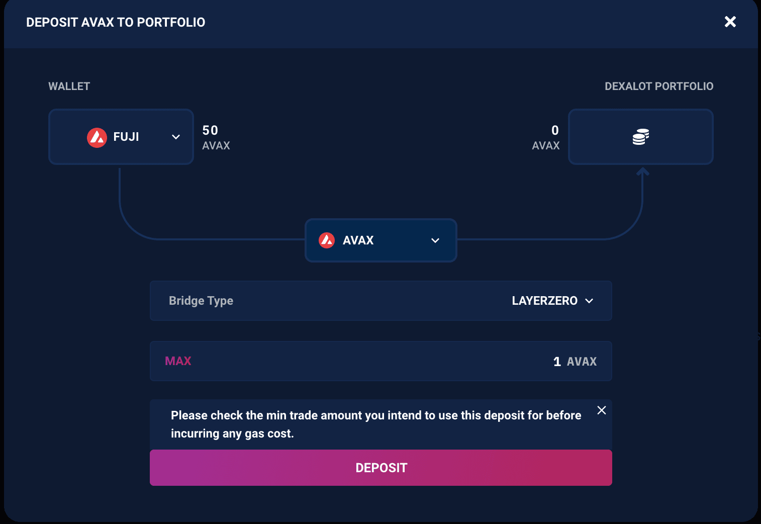 Enter 1 AVAX and click Deposit. Confirm the transaction in your wallet.