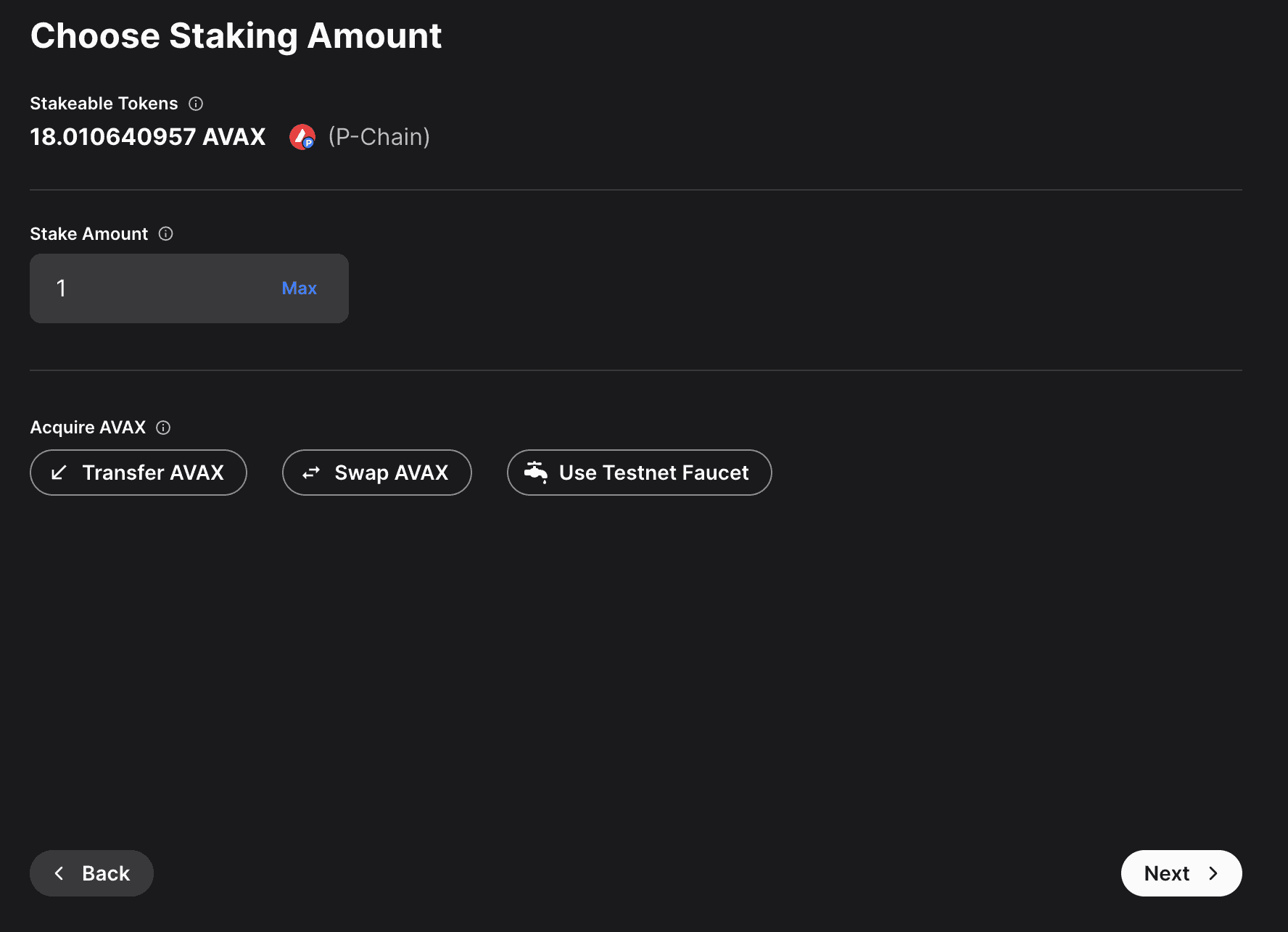- Stake Amount: The amount of AVAX to lock for staking. On Mainnet, the minimum required amount is 2,000 AVAX. On Testnet the minimum required amount is 1 AVAAX.